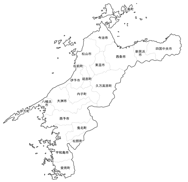 松山市、今治市、東温市、西条市、新居浜市、四国中央市、伊予市、松前町、砥部町、久万高原町、内子町、大洲市、八幡浜市、伊方町、西予市、鬼北町、松野町、宇和島市、愛南町となっております。